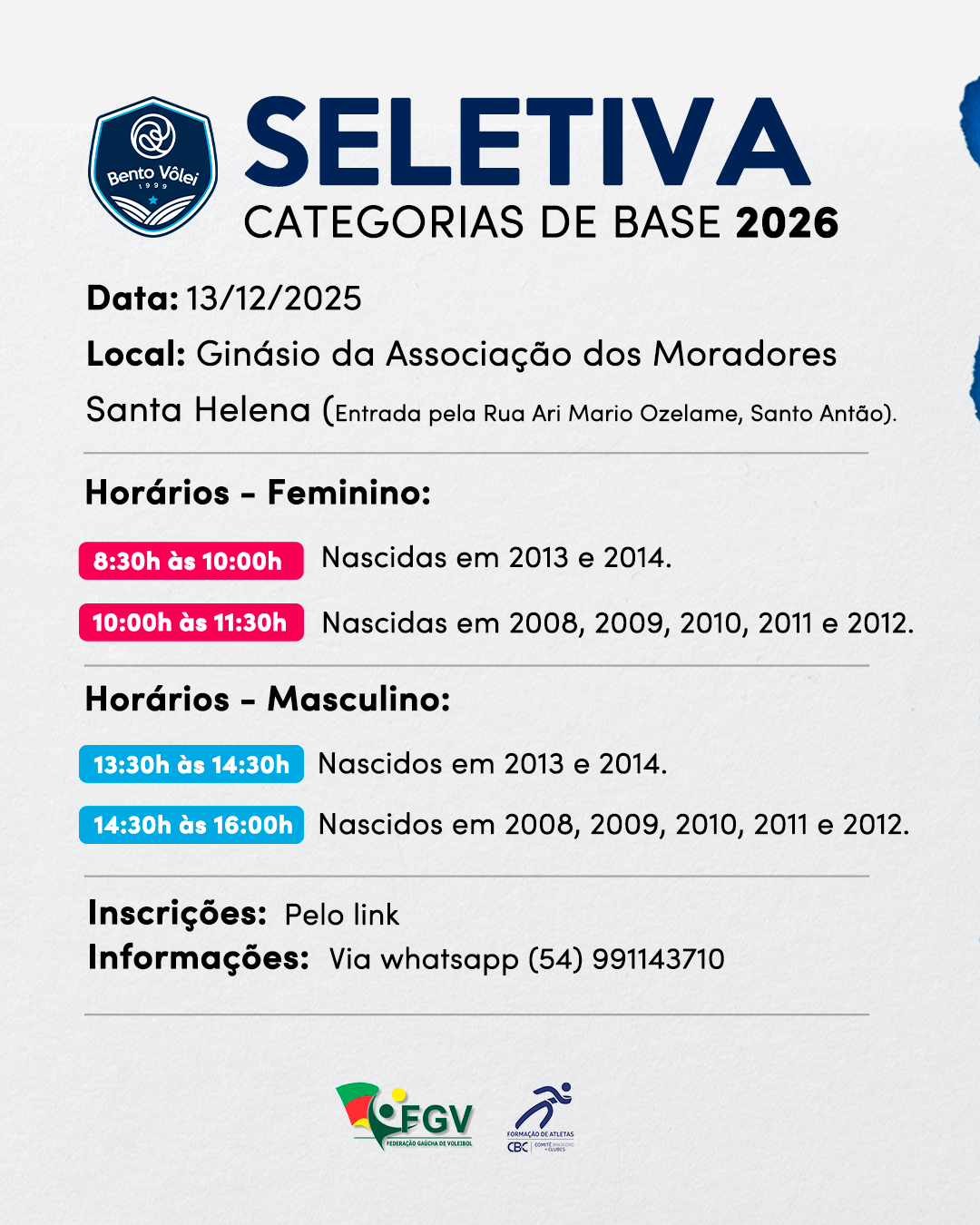 No dia 13/12/2025 (sábado), o Bento Vôlei realizará a Seletiva para as Categorias de Base 2026.